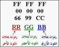 إذن فالرقم السداس عشري FF على اليسار يمثل الدرجة 255 للون الأحمر. والرقم FF في الوسط يمثل الدرجة 255 من اللون الأخضر. والرقم FF على اليمين يمثل الدرجة 255 من اللون الأزرق.