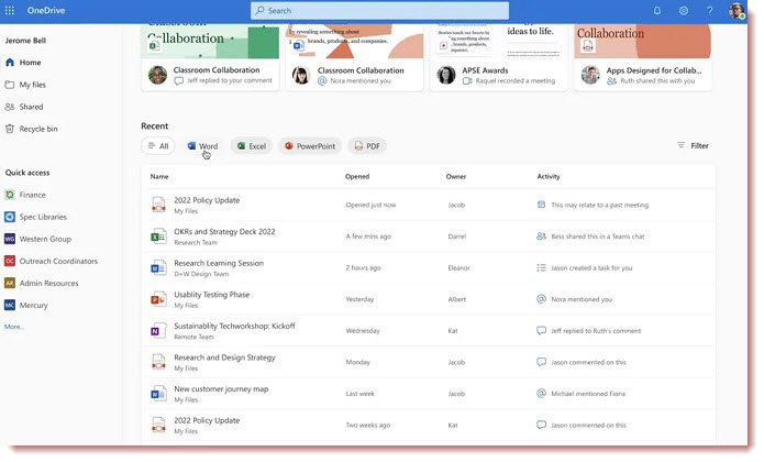 أو يعين لك مهمة داخل مستند مشترك. على الجانب الأيسر من عرض الصفحة الرئيسية ، تضيف Microsoft قسم وصول سريع جديد