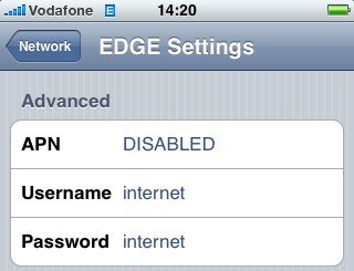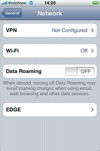لكي تستفيد من هاتف آي-فون في تصفح الشبكة العنكبوتية و مطالعة بريدك الألكتروني يلزمك الأرتباط بالانترنت اما عن طريق الواي فاي (WIFI) ام عن طريق مقدم الخدمة الخاص بك, لكن هل مقدم الخدمة الخاص بك يدعم EDGE, هذا كان السؤال الذي سئلته لخدمة الدعم الفني لشبكة فودافون مصر, وكانت الاجابة اشبه ما تكون بــ (يعني ايه EDGE؟؟!), وتيقنت بعد طول كلام انه لن يستطيع احد مساعدتي, ففتحت الهاتف وضغط علي أيقونة (Settings) ثم (General) ثم (Network)